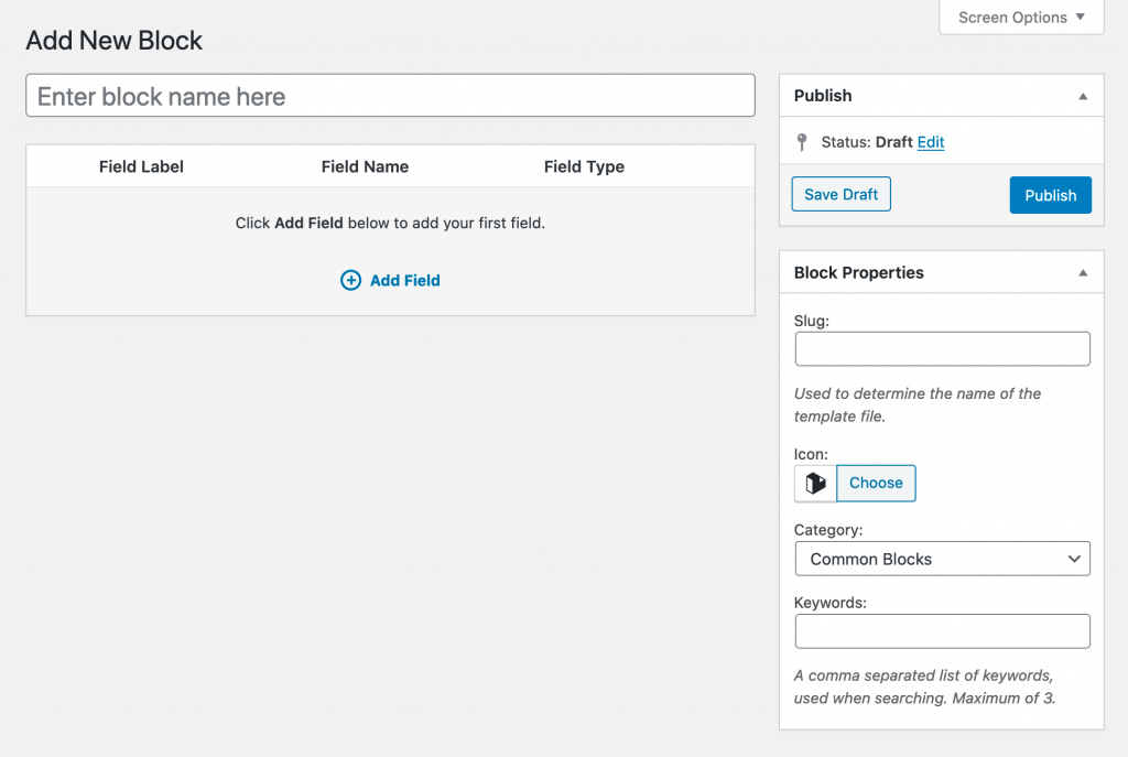 Once you’ve named your block, click the ”add field” button to start adding some actual customized functionality to your block.