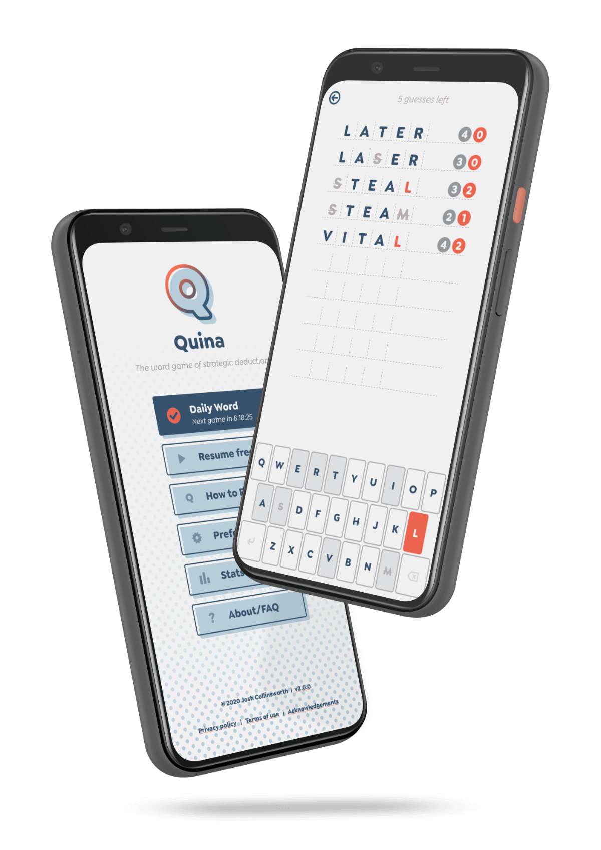 Quina is a strategic, logical word game, built from scratch with Nuxt. The gameplay is based on classic pen-and-paper word games (think: Mastermind, but with words), but the app and design are 100% original.